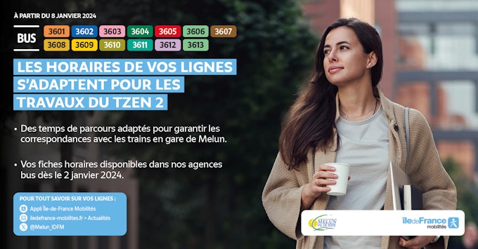 A partir de 8 de janeiro de 2024, os horários de suas linhas serão adaptados na área de Grand Melun durante as obras do TZen 2.