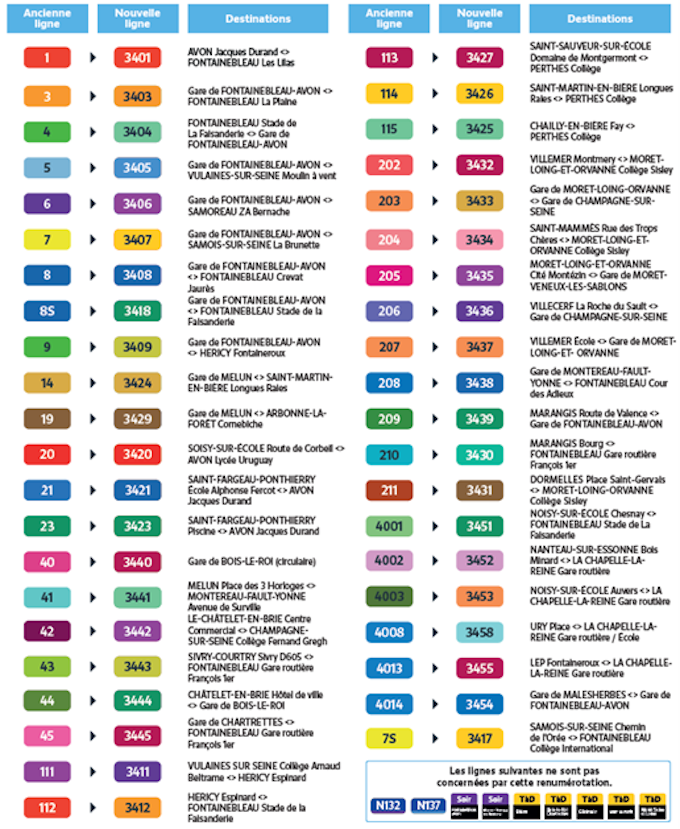 No território de Fontainebleau - Moret, todas as suas linhas agora são renomeadas a partir do código de área "34", ao qual é adicionado um número consistente com o antigo nome da linha (na medida do possível!)