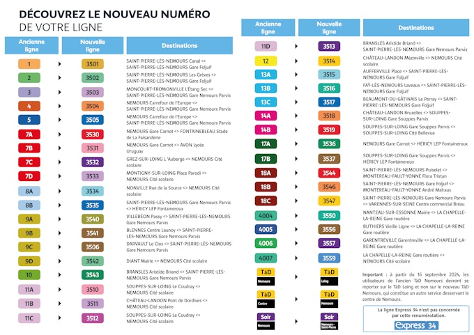 No território do Vale do Loing - Nemours, todas as suas linhas agora são renomeadas a partir do indicativo de chamada "35", ao qual é adicionado um número consistente com o antigo nome da linha (na medida do possível!)