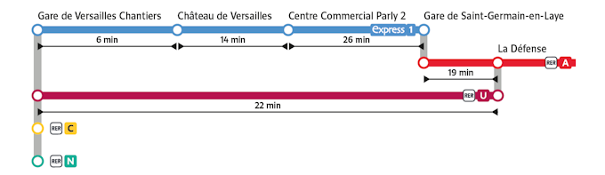 Projetada para simplificar sua vida diária, a linha Express 1 oferece conexões rápidas e regulares entre as estações de Saint-Germain-en-Laye e Versailles Chantiers com: