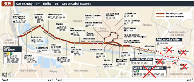 - Novo terminal: "Bois des Coudraies" e terminal parcial "Résidence La Vallée". As paradas entre "Résidence La Vallée" e "Gare de Corbeil-Essonnes" não são mais atendidas.
