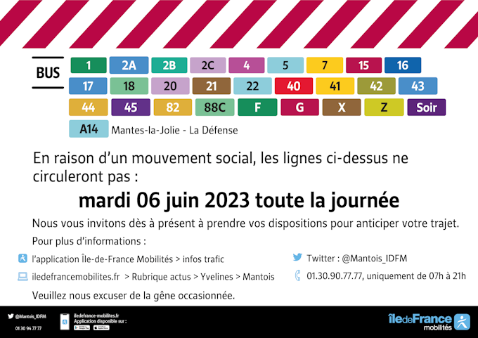 Os horários das suas linhas 19, 34, 72, 73, 74, 75, 76, 87, 88B, 89, 90, 109, 110, Extrême Soire, N51 e A14 Bonnières são mantidos.