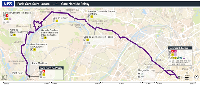 A linha N155 conecta a estação Paris Saint-Lazare a Poissy via Porte d'Asnières, Cormeilles-en-Parisis, Frette-Montigny, Herblay, Conflans-Sainte-Honorine, Conflans Fin-d'Oise, Maurecourt e Andrésy.