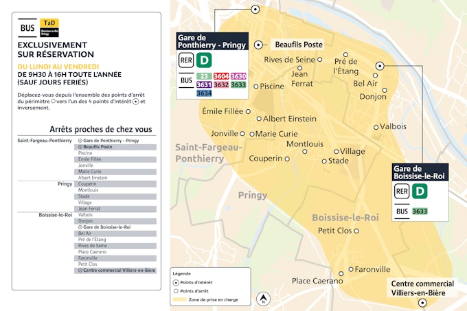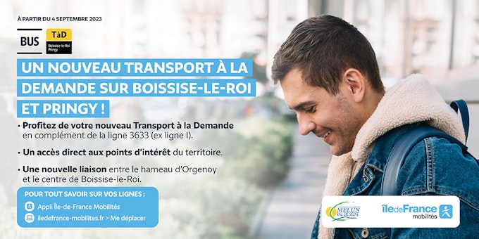 Transporte à la Demande Boissise-le-Roi Pringy oferece um serviço complementar à linha 3633 de segunda a sexta-feira, das 9h30 às 16h.