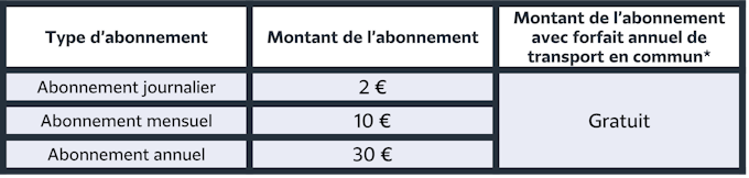 As assinaturas do estacionamento de bicicletas fechado e seguro são gratuitas para assinantes da rede de transporte público com um passe Navigo personalizado e que tenham um passe Navigo anual válido (Navigo Annual, Navigo Annual Senior, Imagine'R Scolaire, Imagine'R étudiant).