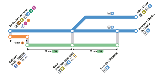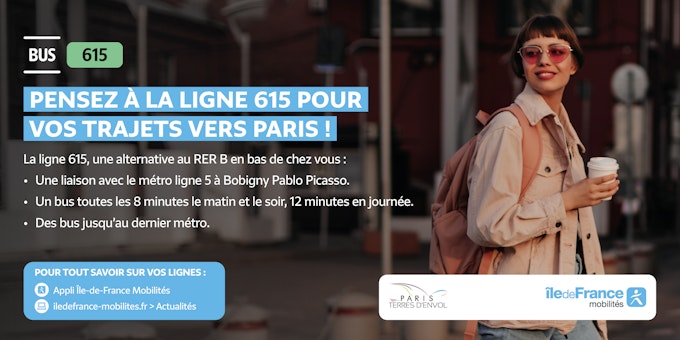 A linha 615 liga a Gare de Villepinte à estação de metrô da linha 5 Bobigny Pablo Picasso, via Gare d'Aulnay-sous-Bois.