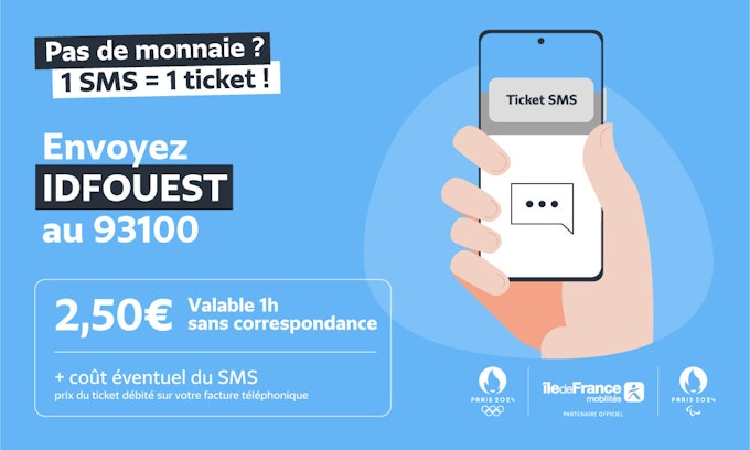 O Bilhete de Embarque SMS é vendido exclusivamente individualmente. Tudo o que você precisa fazer é enviar "IDFOUEST" para 93 100 e você receberá um bilhete na forma de SMS! Você será cobrado em sua conta de celular.