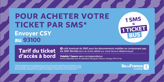 Por um custo de 2,50 €*, o bilhete SMS permitir-lhe-á viajar durante 1 hora sem ligação a bordo dos nossos autocarros. O preço do bilhete será debitado da sua conta telefônica.