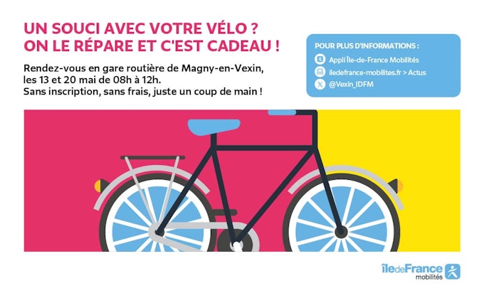 Por ocasião do May by Bike, a Île-de-France Mobilités está apoiando você neste mês dedicado ao uso deste meio de transporte suave para celebrar e adotar a prática do ciclismo. Assim, na área de Vexin, a Île-de-France Mobilités organiza estandes de conserto de bicicletas nas estações.