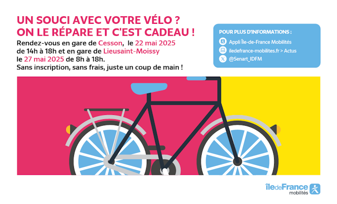Por ocasião do May by Bike, a Île-de-France Mobilités está apoiando você neste mês dedicado ao uso deste meio de transporte suave para celebrar e adotar a prática do ciclismo. Assim, no território de Sénart, a Île-de-France Mobilités organiza estandes de conserto de bicicletas nas estações.
