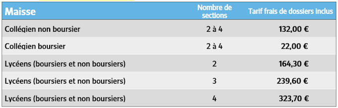 • O município de Maisse é responsável por parte do mapa. Tendo em conta esta ajuda, os pais devem enviar-nos um cheque no valor correspondente ao número de secções a pagar à KEOLIS (tabela abaixo):