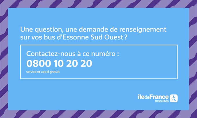 Este serviço já está implantado no território Essonne Sudoeste. Você tem alguma pergunta ou informação sobre seus ônibus? Você pode entrar em contato conosco pelo telefone 0 800 10 20 20.