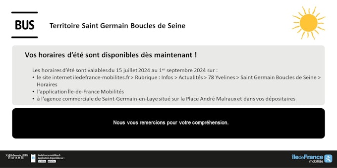 - O site iledefrance-mobilites.fr > Seção: Informações > Notícias > 78 Yvelines > Saint Germain Boucles de Seine > Horário de funcionamento