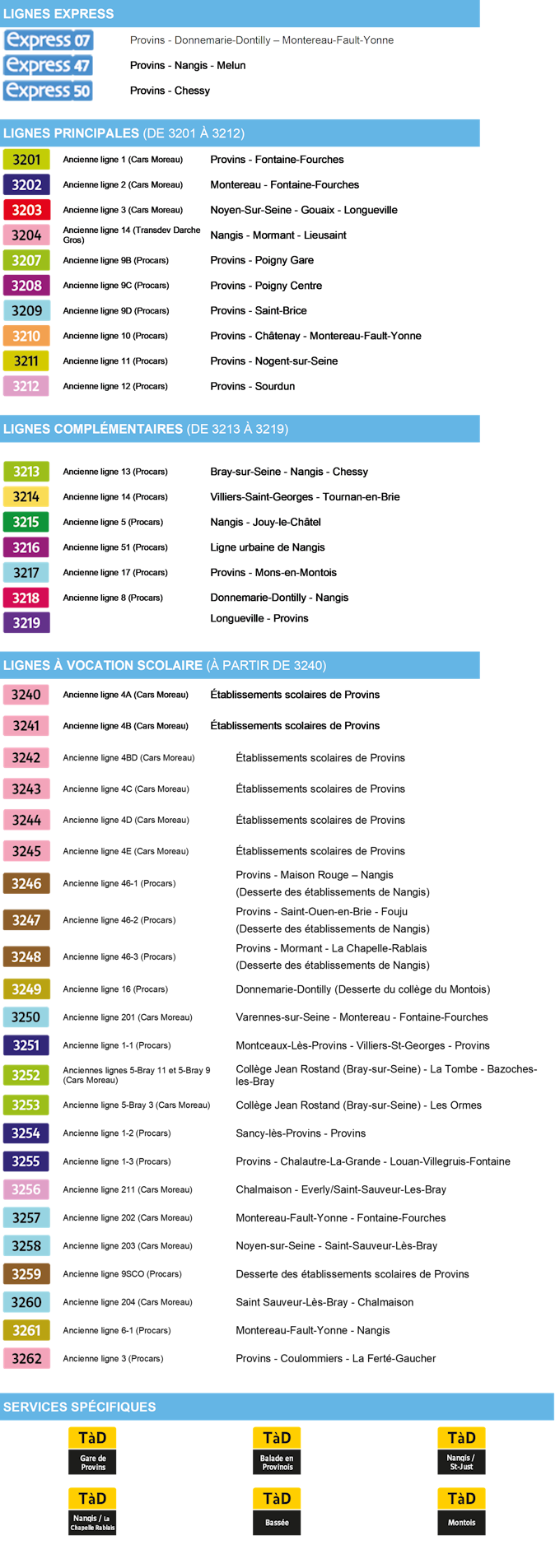 A Île-de-France foi dividida em departamentos e setores, cada um com um código específico. Na área de Provinois – Brie et Seine, todas as linhas regulares de ônibus agora começam com 32, exceto as linhas expressas.