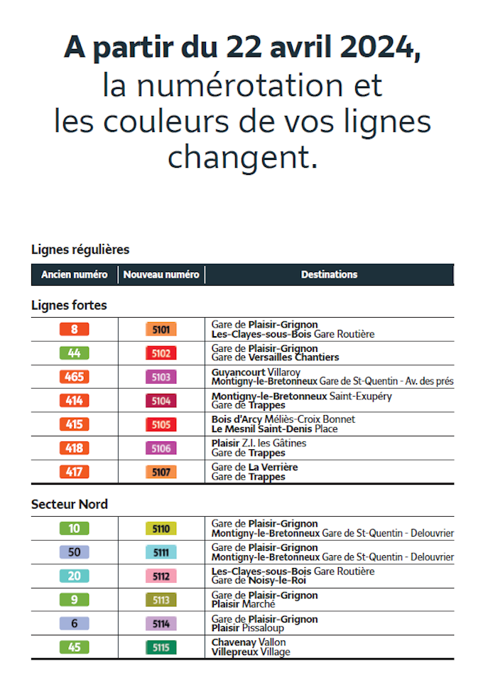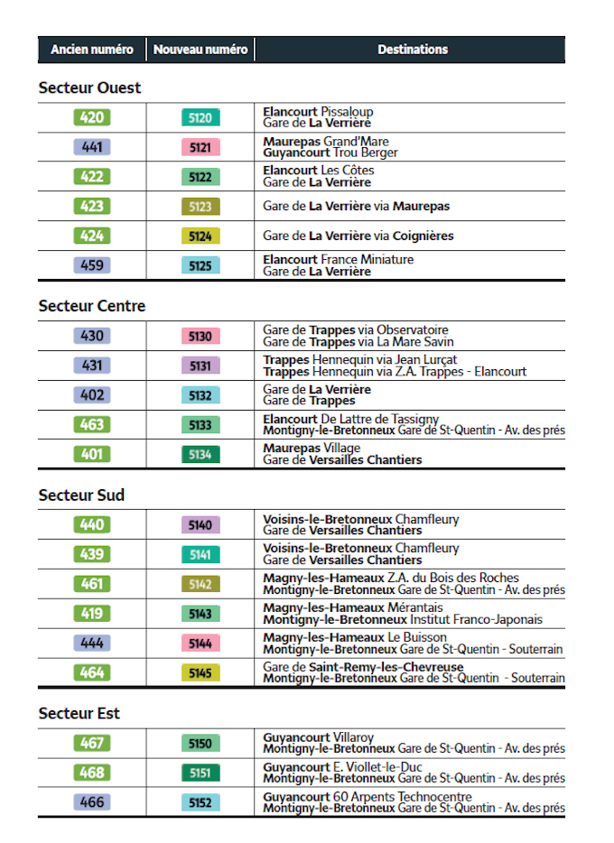 A Île-de-France foi dividida em departamentos e setores, cada um com um código específico. Os números das linhas de ônibus em Saint-Quentin-en-Yvelines agora começam com o código de área 51, ao qual são adicionados dois dígitos.