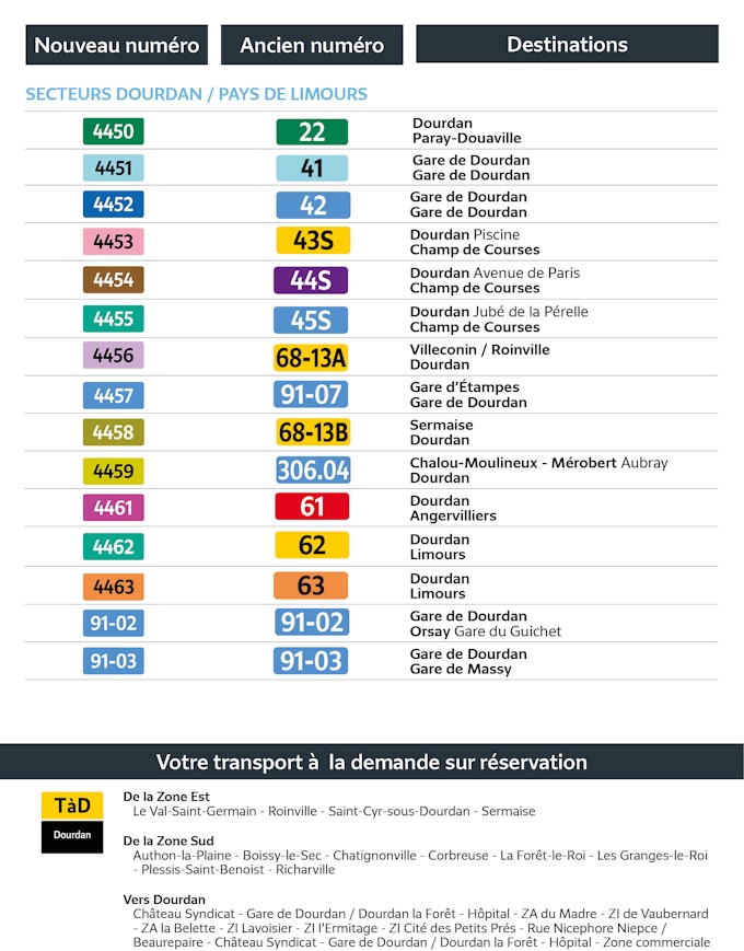 O princípio da renumeração foi estabelecido por sector. Você encontrará as linhas numeradas de 4401 a 4418 no setor de Etampes, as linhas 4430 a 4442 nos setores da Comunidade de Comunas Entre Juine et Renard e da Comunidade de Comunas de Val d'Essonne e, finalmente, as linhas com os números 4450 a 4463 nos setores de Dourdan / Pays de Limours.
