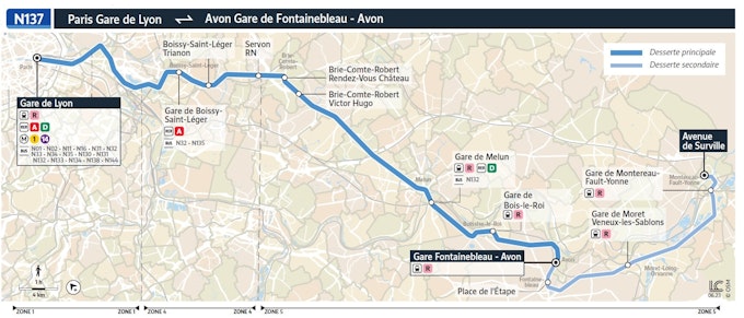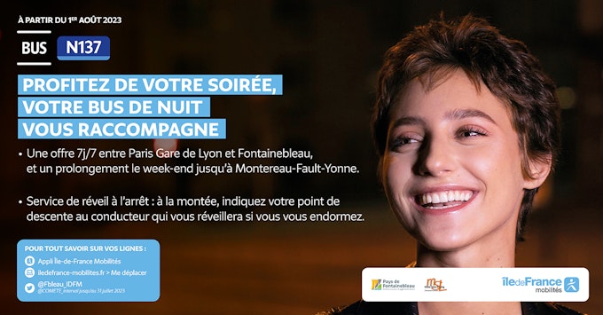 A partir de 1º de agosto de 2023, seu novo ônibus noturno N137 conectará Fontainebleau a Paris da 1h às 5h, com uma viagem de Paris Gare de Lyon > Gare de Fontainebleau Avon em 1 hora e 34 minutos, durante todo o ano, 7 dias por semana. A rota é estendida até Montereau-Fault-Yonne nos fins de semana e feriados.