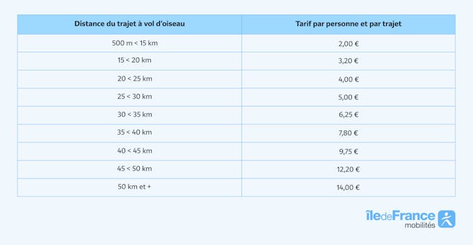 Tabela mostrando as taxas por pessoa e por viagem de acordo com a distância da viagem em linha reta: