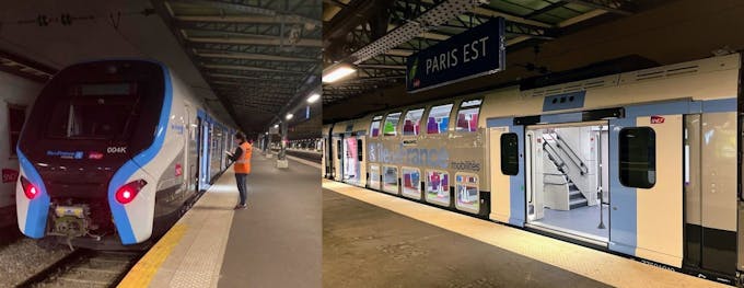 Esses trens RER NG funcionarão em condições reais sem passageiros a bordo no meio dos trens atuais. Para evitar que os passageiros embarquem nos trens, adesivos afixados nas janelas e mensagens sonoras serão colocadas para informação!