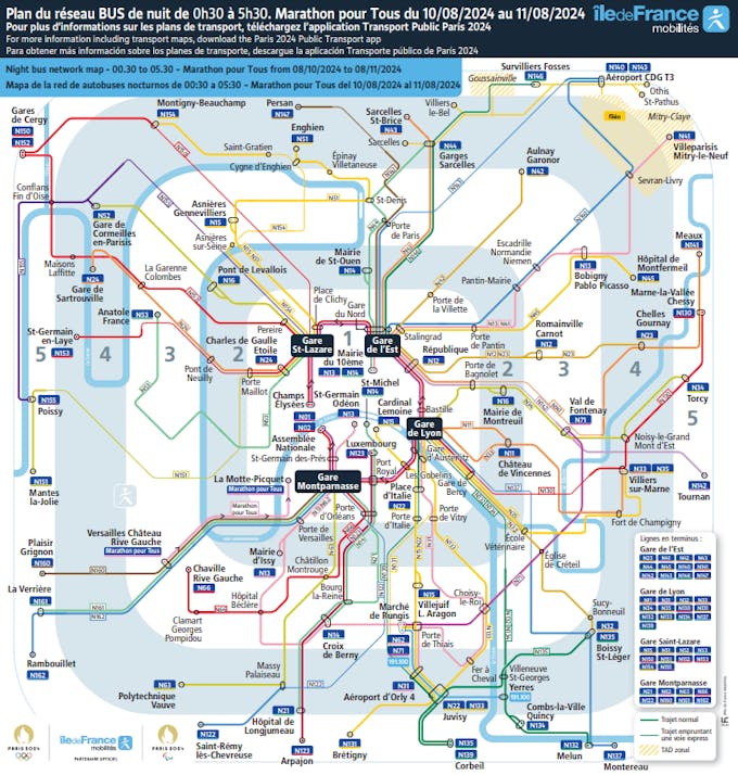 Ao longo dos Jogos Olímpicos e Paralímpicos de Paris 2024, um ônibus noturno está programado a cada 20 minutos, em comparação com 30 em horários normais.