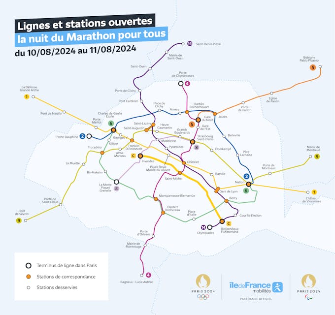 Por ocasião da Maratona pour Tous, na noite de 10 para 11 de agosto de 2024, serão servidas as seguintes paragens durante toda a noite: