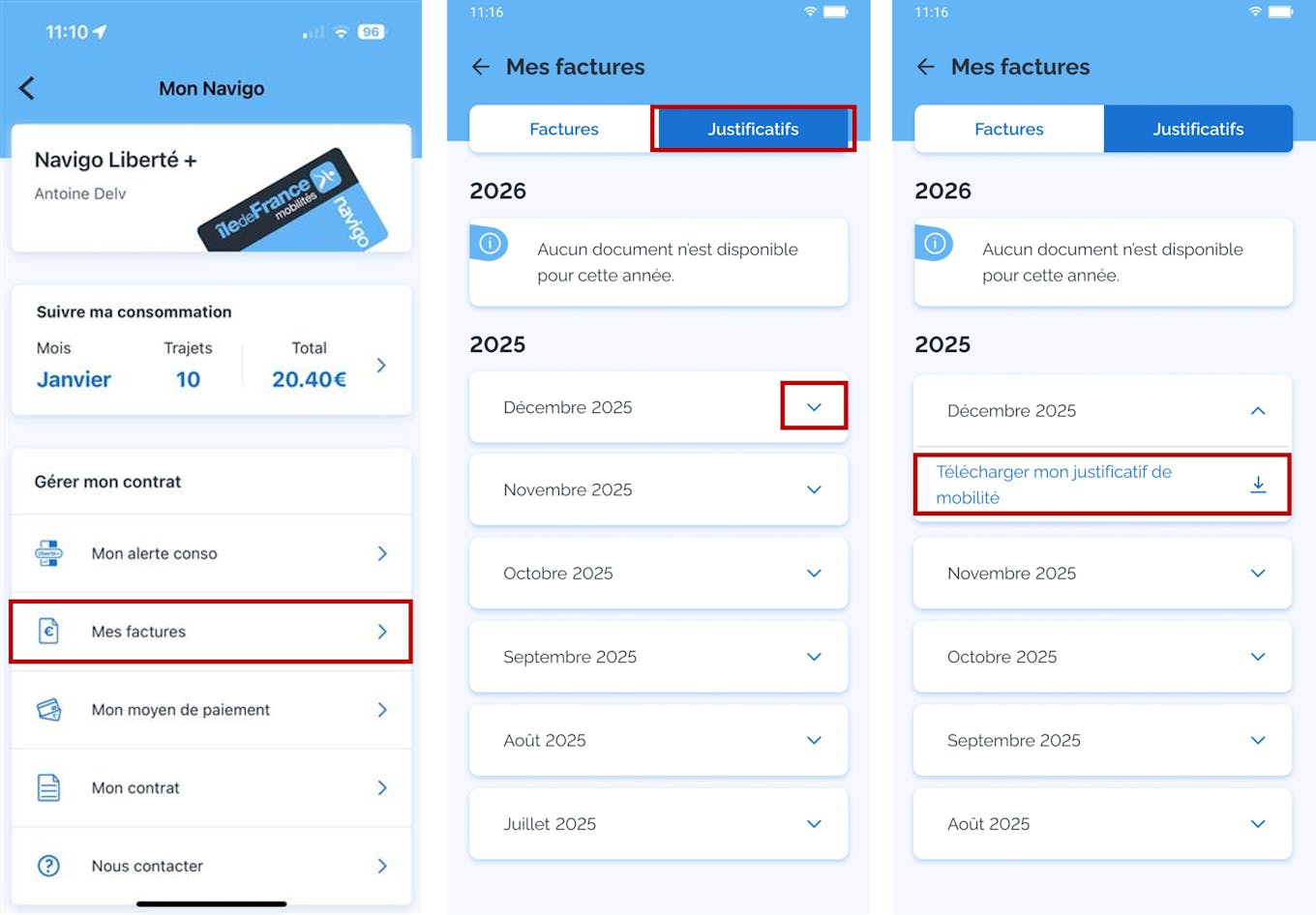 Um Navigo Liberté + comprovante de mobilidade está disponível para você todo mês (no máximo até o dia 11 do mês seguinte às viagens realizadas) no seu espaço pessoal, no aplicativo móvel Île-de-France Mobilités, na seção "Minhas faturas", na aba "Comprovação".