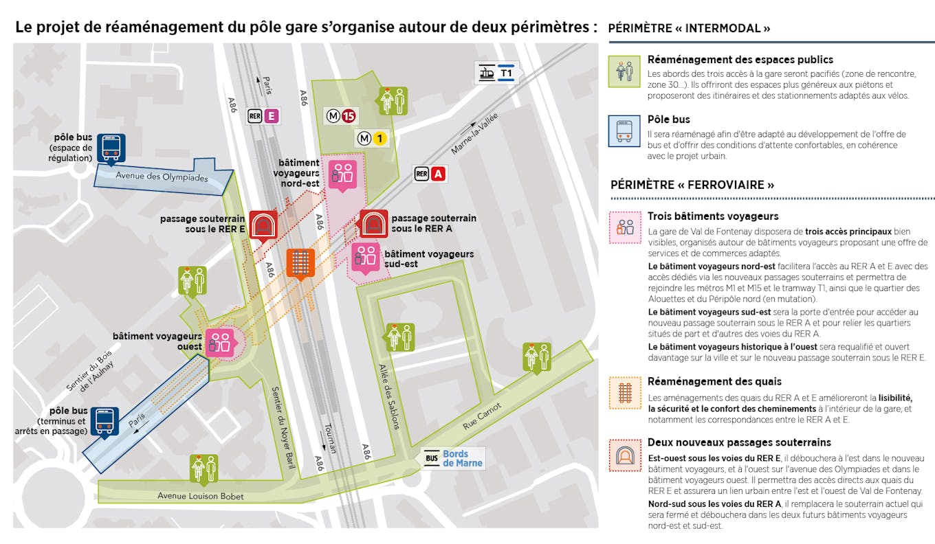 O hub da estação Val de Fontenay passará por profundas mudanças até 2035: seu número de passageiros aumentará 115% devido ao comissionamento de novas linhas de transporte público (Tram T1, Metrô 1, Metrô 15 e RER E estendidos para o oeste e o Bus Bords de Marne) e cerca de 600.000 m² de projetos urbanos estão planejados na área circundante. Para apoiar essas mudanças e melhorar a operação da estação e seu acesso por todos os modos de viagem, o hub de Val-de-Fontenay será completamente reconstruído.