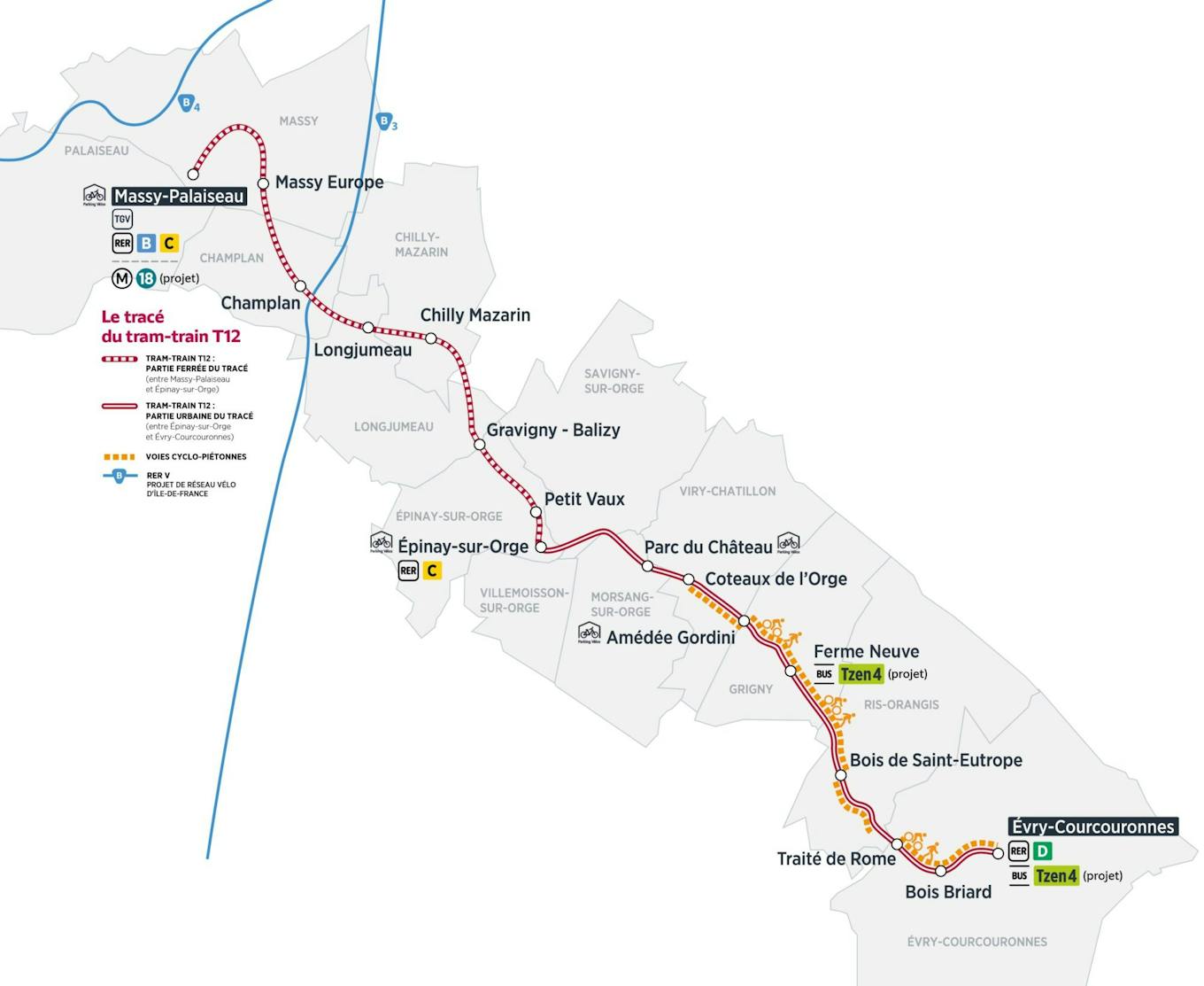 O RER B, C e D, linhas de ônibus locais e os projetos do metrô 18 e da linha de ônibus T Zen 4, o TGV em Massy