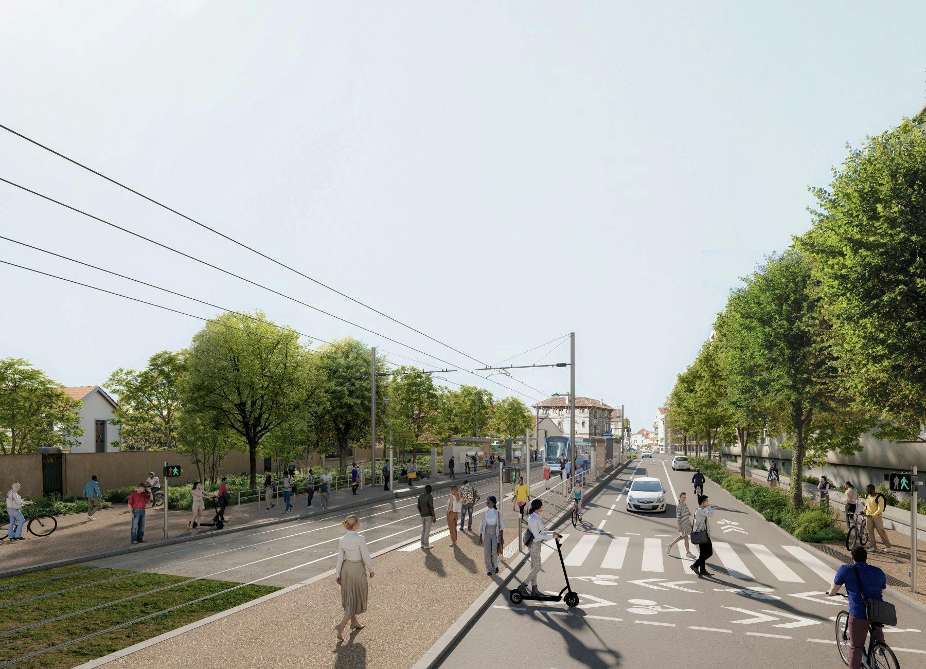 O bonde será inserido na Rue Adrienne Bolland ao longo da via existente e uma proteção visual, em relação aos trilhos do RER, será criada como parte do projeto.