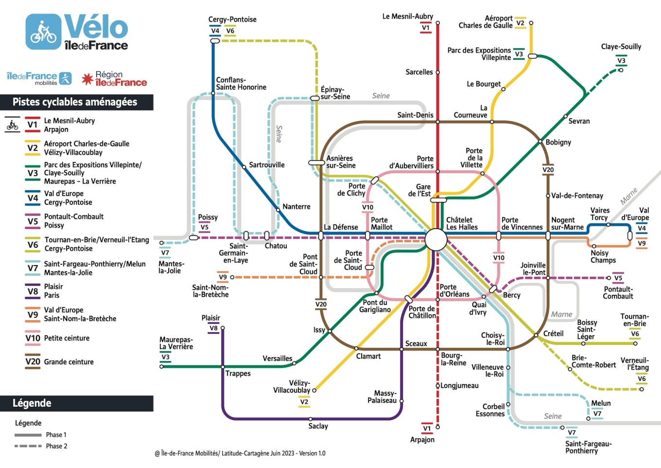 Eventualmente, haverá 9 "linhas" de ciclovias contínuas e confortáveis, permitindo que você atravesse a Île-de-France. Inicialmente, estão previstas 12 áreas prioritárias a partir de 2025, incluindo: